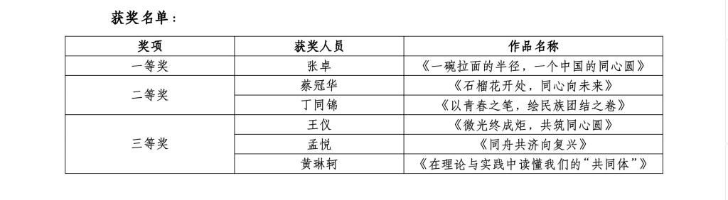 比赛以“筑牢中华民族共同体意识”为核心命题,共征集到162位同学的原创作品。参赛文稿紧扣“民族团结”“文化交融”“共同奋斗”“复兴梦想”等时代关键词,生动诠释了中华民族共同体的历史渊源与当代价值,展现出青年学子对“休戚与共、荣辱与共、生死与共、命运与共”共同体理念的深刻思考。经过严格评审,赛事秉持“思想性、时代性、主题鲜明、内容生动、富有感染力”的标准,最终评选出一等奖1名、二等奖2名、三等奖3名,全过程体现公平、公正、公开原则。