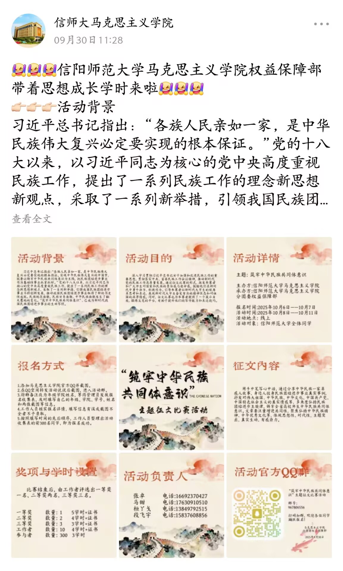 为深入学习贯彻习近平总书记关于加强和改进民族工作的重要思想,落实中央及省委民族工作会议精神,推动新时代党的民族工作高质量发展。星空XK于10月8日至11日在线上举办“筑牢中华民族共同体意识”主题征文比赛。本次活动由星空官网院学生会权益保障部组织,面向信阳师范大学全体同学进行征稿,旨在搭建起铸牢中华民族共同体意识的育人平台。