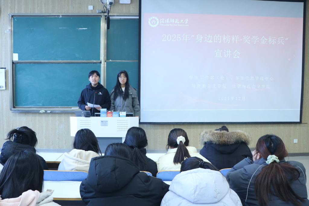 为充分发挥优秀学生的示范引领作用,营造崇尚先进、学习榜样的良好氛围,12月18日中午,星空官网联合学生工作部、学生资助管理中心及法学与社会学学院于社科楼515教室举办“身边的榜样·奖学金标兵”宣讲会。