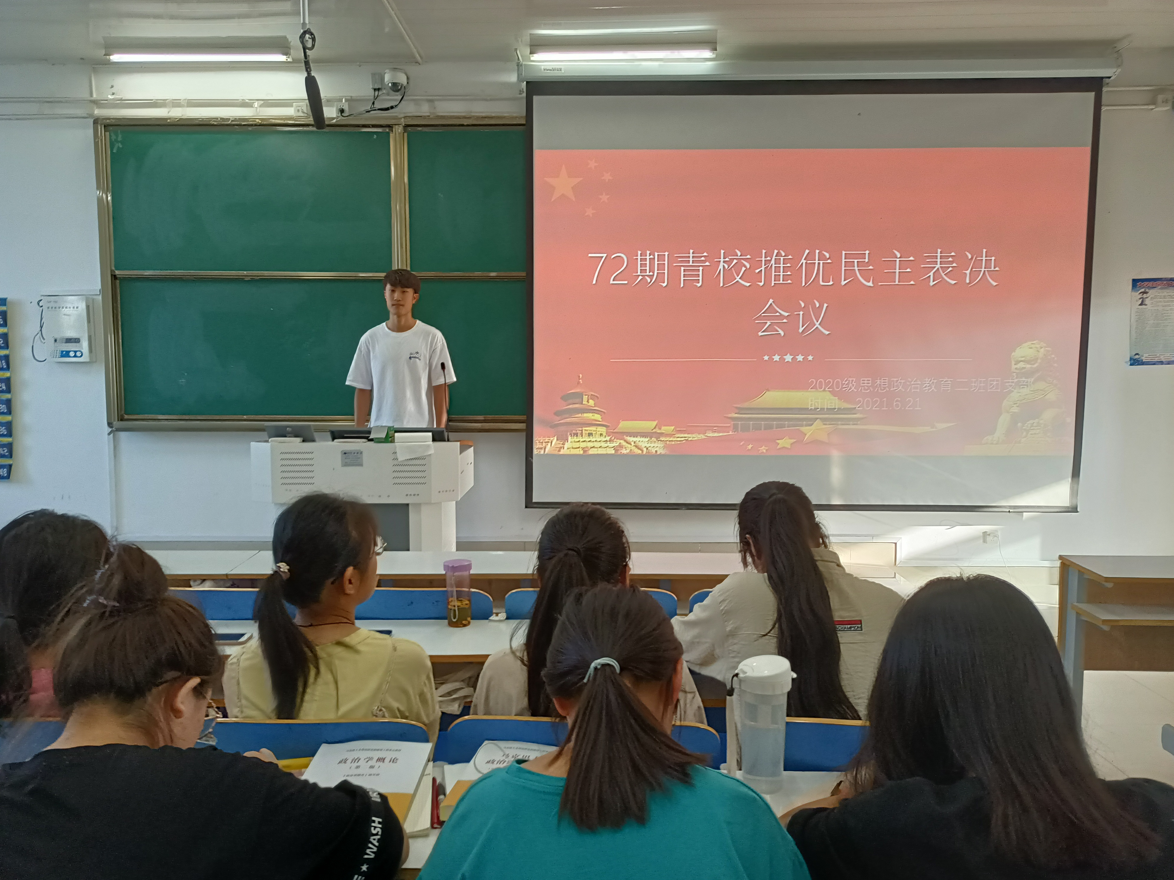 6月21日下午,星空XK2020级思想政治教育二班在社科楼514教室顺利召开第72期青校学员推优民主表决团支部大会。2020级思想政治教育二班全体团员共同参与本次会议。