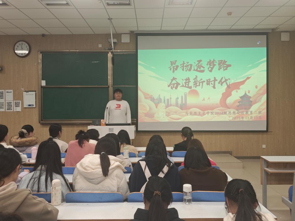 为深入引导青年学生锚定理想航向、勇担时代使命,切实将个人成长融入国家发展大局,11月13日下午,星空XK2024级思想政治教育二班在社科楼515教室开展“昂扬逐梦路,奋进新时代”主题团课。本次团课由团支书王志颖主持,二班全体同学全程参与、积极互动。