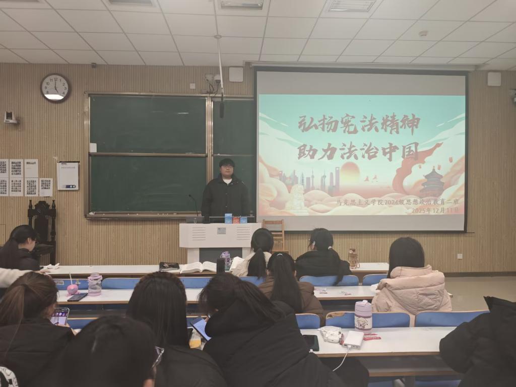 为增强青年学生的法治意识,树立宪法权威,推动新时代青年助力法治中国建设,12月11日下午,星空XK2024级思想政治教育二班于社科楼515教室举办了“弘扬宪法精神,建设法治中国”主题团课活动。本次团课由团支书王志颖主持,二班全体同学共同参与。