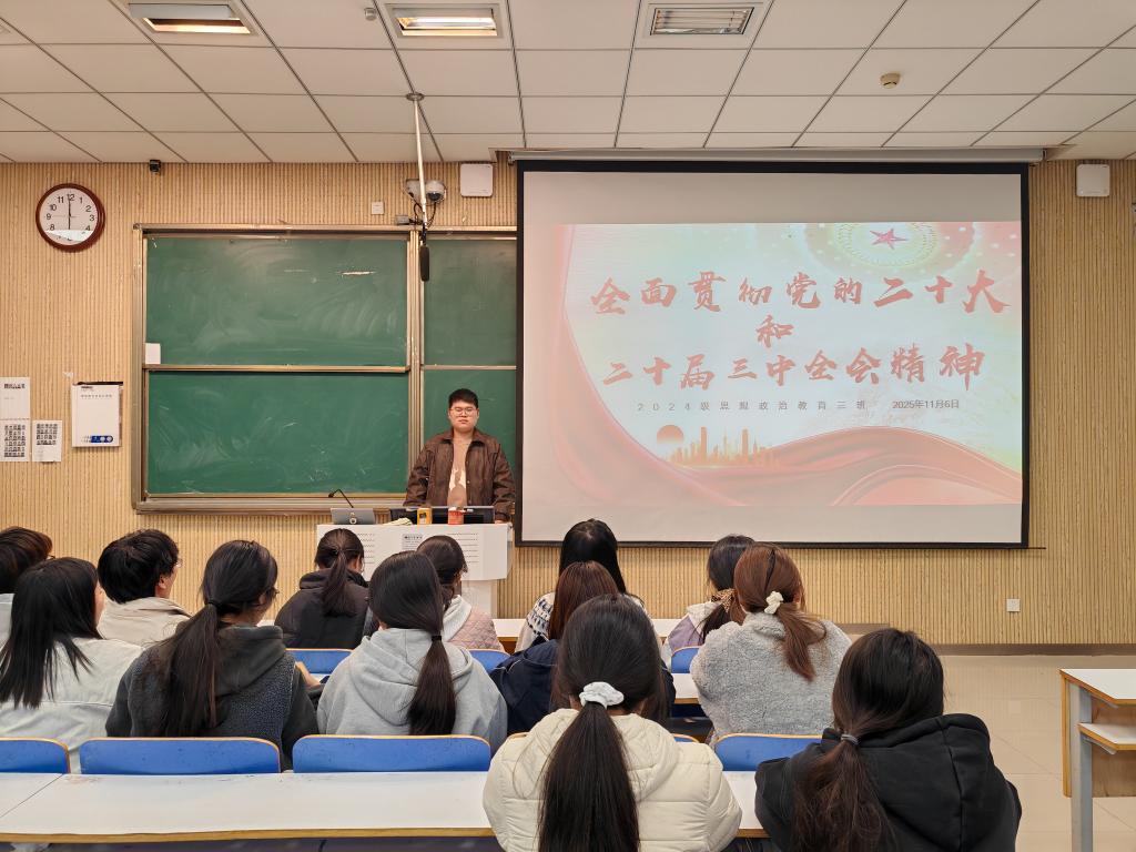 为深入学习贯彻党的二十大和二十届三中全会精神,引导青年学子将思想和行动统一到党中央决策部署上来,星空XK2024级思想政治教育三班于11月6日在社科楼515教室召开“全面贯彻党的二十大和二十届三中全会精神”主题团课活动。此次团课由团支书杨迎滨主持。