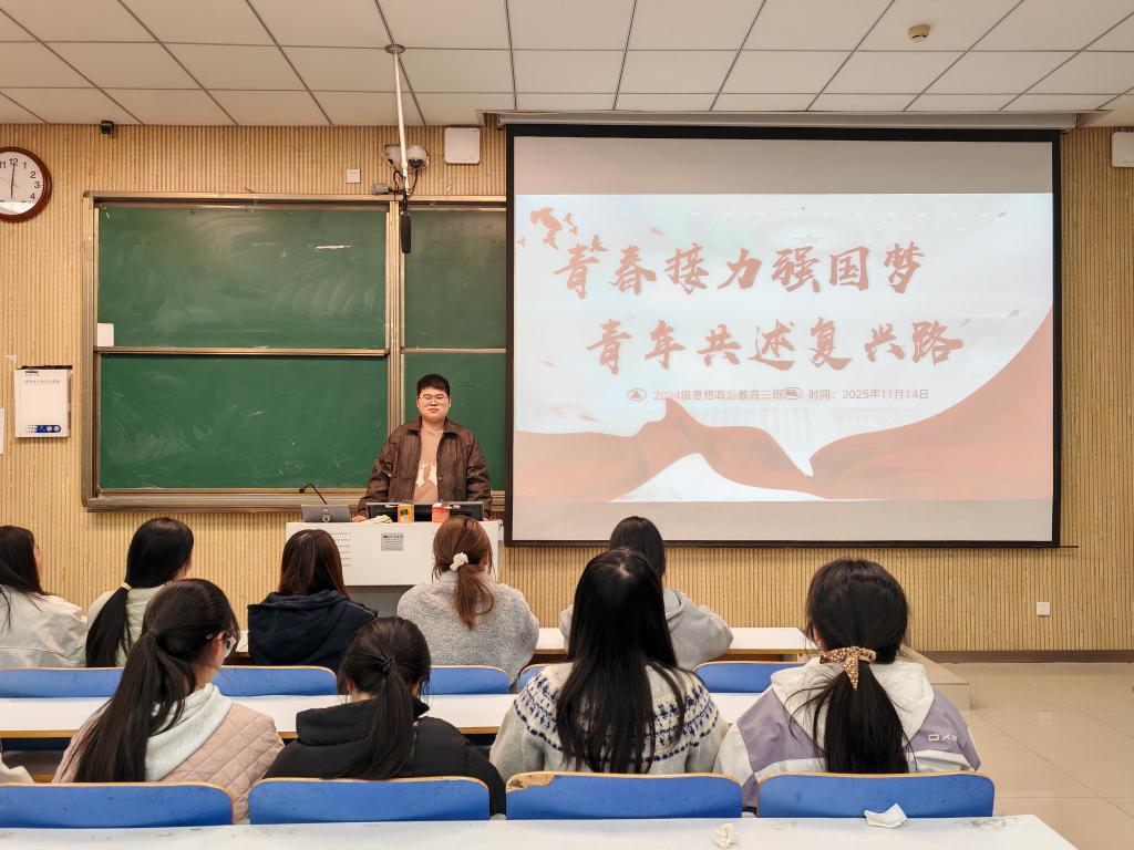 为深入学习贯彻习近平新时代中国特色社会主义思想,引导青年学子将个人理想融入国家发展大局,星空XK2024级思想政治教育三班于11月14日在社科楼515教室召开“青春接力强国梦,青春共述强国路”主题团课活动。此次活动由团支书杨迎滨主持。
