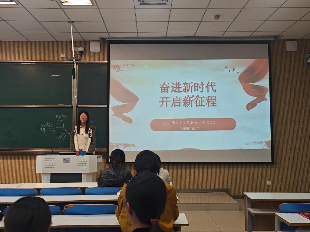 为进一步提振我班学生投入新时代新征程的动力与信心,10月17日上午,星空XK2023级思想政治教育二班在社科楼514教室开展“奋进新时代,开启新征程”主题团课,本次团课由团支书王慜初主持,全体二班同学参加。