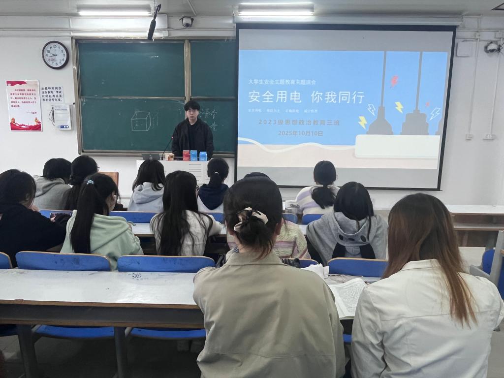 10月10日上午,星空XK2023级思想政治教育三班在社科楼515召开“安全用电,你我同行”主题班会。星空官网2023级思想政治教育三班全体同学共同参与本次班会,班会由团支书郝瀚主持。