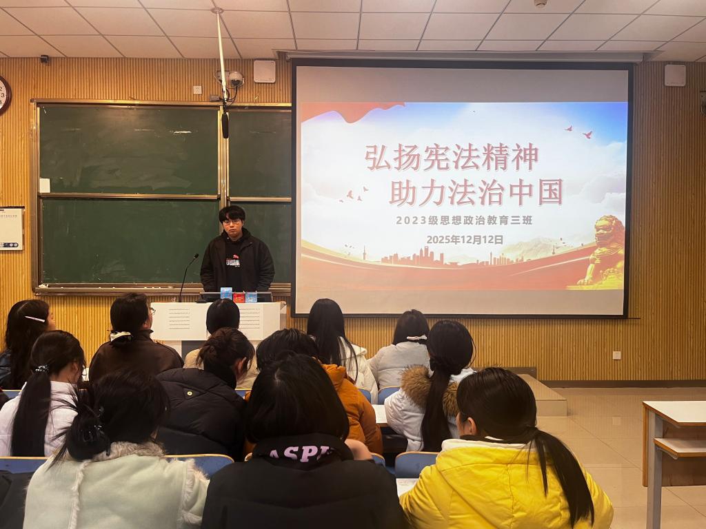 团课伊始,郝瀚指出,2025年12月3日是第十二个国家宪法日,弘扬宪法精神,推进全面依法治国,更好地发挥法治在国家治理和社会管理中的重要作用,对于全面建设社会主义现代化国家开好局、起好步,具有重大而深远的意义。接着,郝瀚通过ppt向同学们普及法律常识。学生代表张亚蕾发表感悟,她指出,宪法是国家的根本法,是治国安邦的总章程,具有最高的法律地位、法律权威、法律效力。在日常生活中,我们应主动尊法、学法用法,弘扬宪法精神,做一个合格的公民。最后,郝瀚做出总结,他强调,我们要自觉遵守宪法法律,弘扬宪法精神,正确处理权利和义务的关系,不断增强宪法意识,为全面建设社会主义现代化国家的坚实保障。